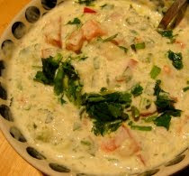 Cortar el tomate en dados muy pequeños. Rallar el pepino, y exprimir esta pulpa con las manos para que salga el máximo de agua. Picar la cebolla, la menta y el cilantro muy finito. Verter todos estos ingredientes en un cuenco, añadir el yogúr y las especias, y mezclar bien. Dejar la raita un momento en la nevera antes de servir, tiene que estar bien fría.