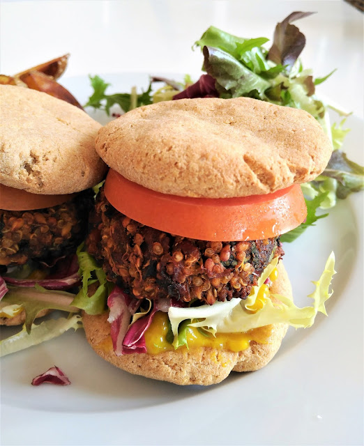 Formar bolitas del tamaño de una albóndiga, y aplanar un poco para dar la forma de mini hamburguesa. Disponer en papel antiadherente, y hornear a 210 grados unos 15 minutos. Sacar del horno y dejar enfríar un poco antes de manipular las hamburguesas : se irán endureciendo a medida que se vayan enfríando y tendremos menos riesgo de romperlas.